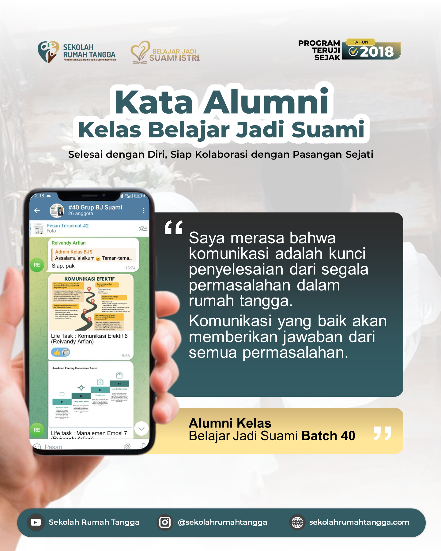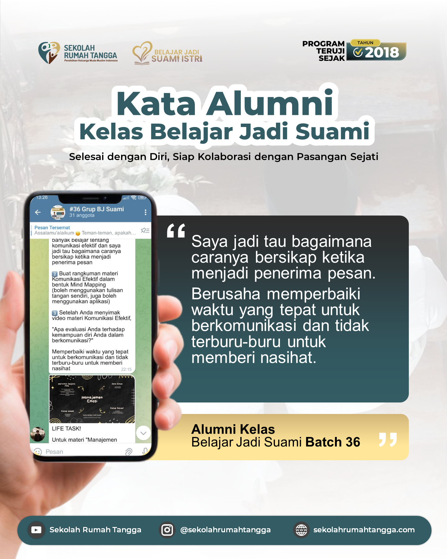 "Anda akan dipandu untuk bisa dewasa secara emosional, mampu menguatkan self-control dengan teknik yang alamiah, juga membangun ketangguhan dalam menghadapi dinamika rumah tangga"