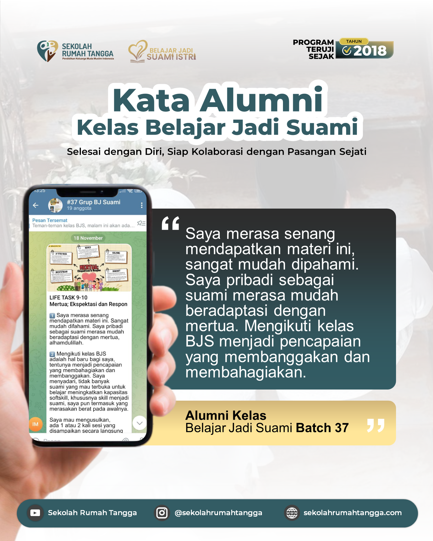 Karena Kelas Belajar Jadi Suami (BJS) akan diawali dengan membangun pondasi mindset yang benar tentang rumah tangga, baru kemudian ke hal-hal teknis. Jadi, diikuti oleh keduanya sangat perlu agar kelak bisa memiliki cara pandang hidup yang selaras tentang keluarga.